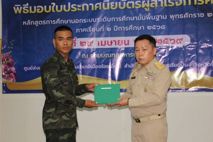 ร้อยเอ็ดจัดพิธีมอบใบประกาศนียบัตรแก่ทหารกองประจำการ ผู้สำเร็จการศึกษาหลักสูตรการศึกษานอกระบบ 49 นาย