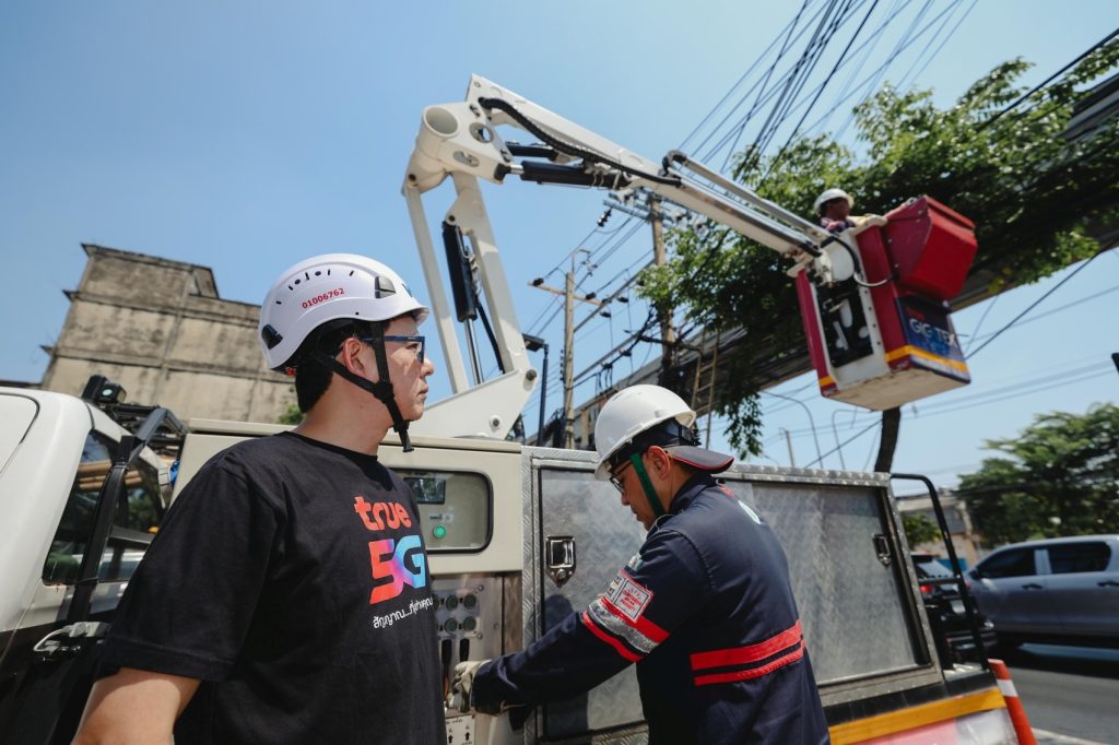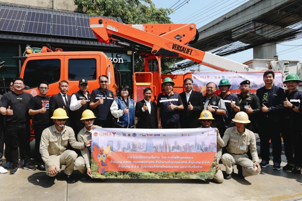 29 เมษายน 2569 กรุงเทพฯ ทรู คอร์ปอเรชั่น เดินหน้าสานต่อภารกิจพลิกโฉมกรุงเทพมหานคร ผนึกความร่วมมือกับ การไฟฟ้านครหลวง (MEA) กรุงเทพมหานคร สำนักงาน กสทช. สำนักงานตำรวจแห่งชาติ และพันธมิตร ลุยปฏิบัติการรื้อถอนสายสื่อสารบนเสาไฟฟ้าและนำสายสื่อสารลงใต้ดิน ถนนลาดพร้าว (ตั้งแต่ ถ.รัชดาภิเษก – ถ.ประดิษฐ์มนูธรรม) รวมระยะทางทั้ง 2 ฝั่ง 8.40 กิโลเมตร โดยมี นายราเชนทร์ อันเวช (ที่ 7 จากขวา) รองผู้ว่าการเทคโนโลยีดิจิทัลและระบบสื่อสาร การไฟฟ้านครหลวง (MEA) เป็นประธานในพิธี พร้อมด้วย นายประถมพงศ์ ศรีนวล (ที่ 7 จากซ้าย) ผู้อำนวยการสำนักวิชาการและการจัดการทรัพยากรโทรคมนาคม สำนักงาน กสทช. และนายกนกศักดิ์ นิ่มนวลรัตน์ (ที่ 2 จากซ้าย) หัวหน้าฝ่ายรัฐกิจและสาธารณูปโภค บมจ.ทรู คอร์ปอเรชั่น ร่วมลงพื้นที่ เร่งจัดระเบียบสายสื่อสารให้เป็นไปตามมาตรฐานสากล เพื่อคืนทัศนียภาพที่สวยงาม เสริมความปลอดภัยให้ประชาชน และวางรากฐานสู่การเป็นมหานครอัจฉริยะอย่างเป็นรูปธรรม