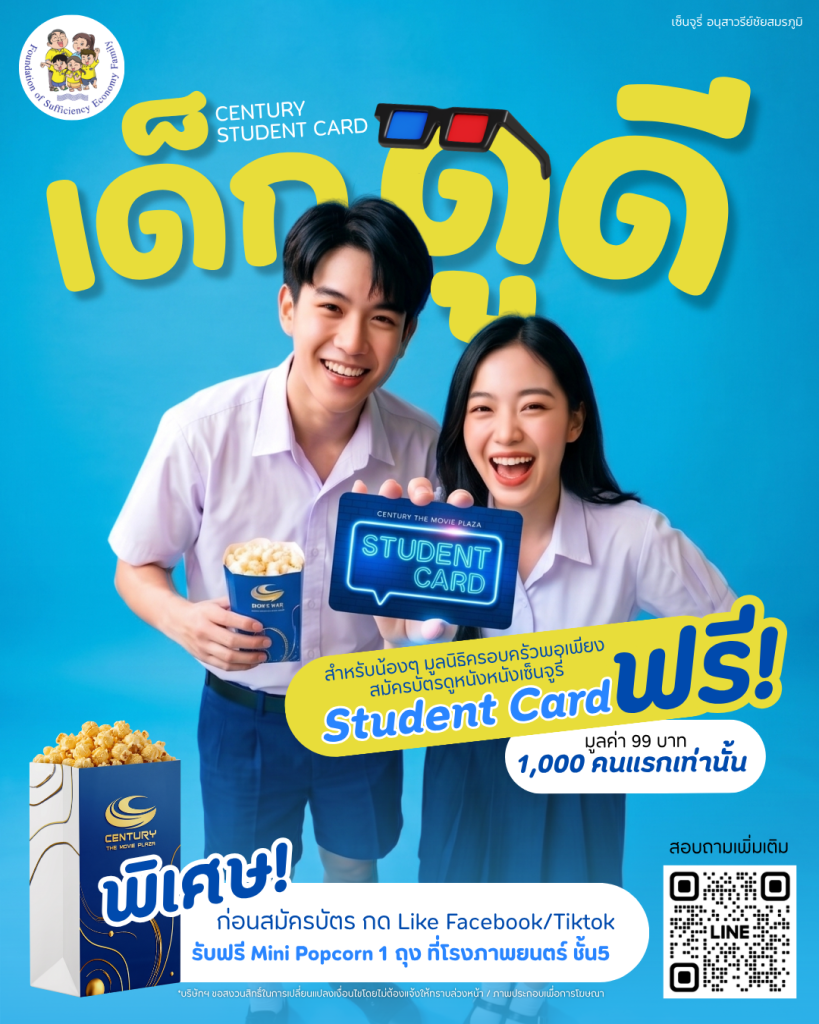 สำหรับสิทธิพิเศษในโครงการนี้ นักเรียนภายใต้เครือข่ายของมูลนิธิครอบครัวพอเพียงสามารถรับสิทธิ์สมัครบัตร Century Student Card ได้ฟรี จากราคาปกติ 99 บาท โดยตัวบัตรสามารถใช้เป็นส่วนลดชมภาพยนตร์ในราคานักเรียน เริ่มต้นเพียง 129 บาท จากราคาปกติ 170 บาท และสามารถใช้สะสมคะแนนเพื่อแลกรับป๊อปคอร์นหรือบัตรชมภาพยนตร์ได้ตลอดทั้งปีจนถึงวันที่ 31 ธันวาคม 2569 นอกจากนี้ยังมีกิจกรรมพิเศษเพียงน้อง ๆ กด Like แฟนเพจ Facebook หรือ TikTok ของ Century จะได้รับฟรีทันที Mini Popcorn 1 ถุง ณ จุดจำหน่ายบัตรชมภาพยนตร์ ชั้น 5 เซ็นจูรี่ เดอะมูฟวี่ พลาซ่า อนุสาวรีย์ชัยฯ